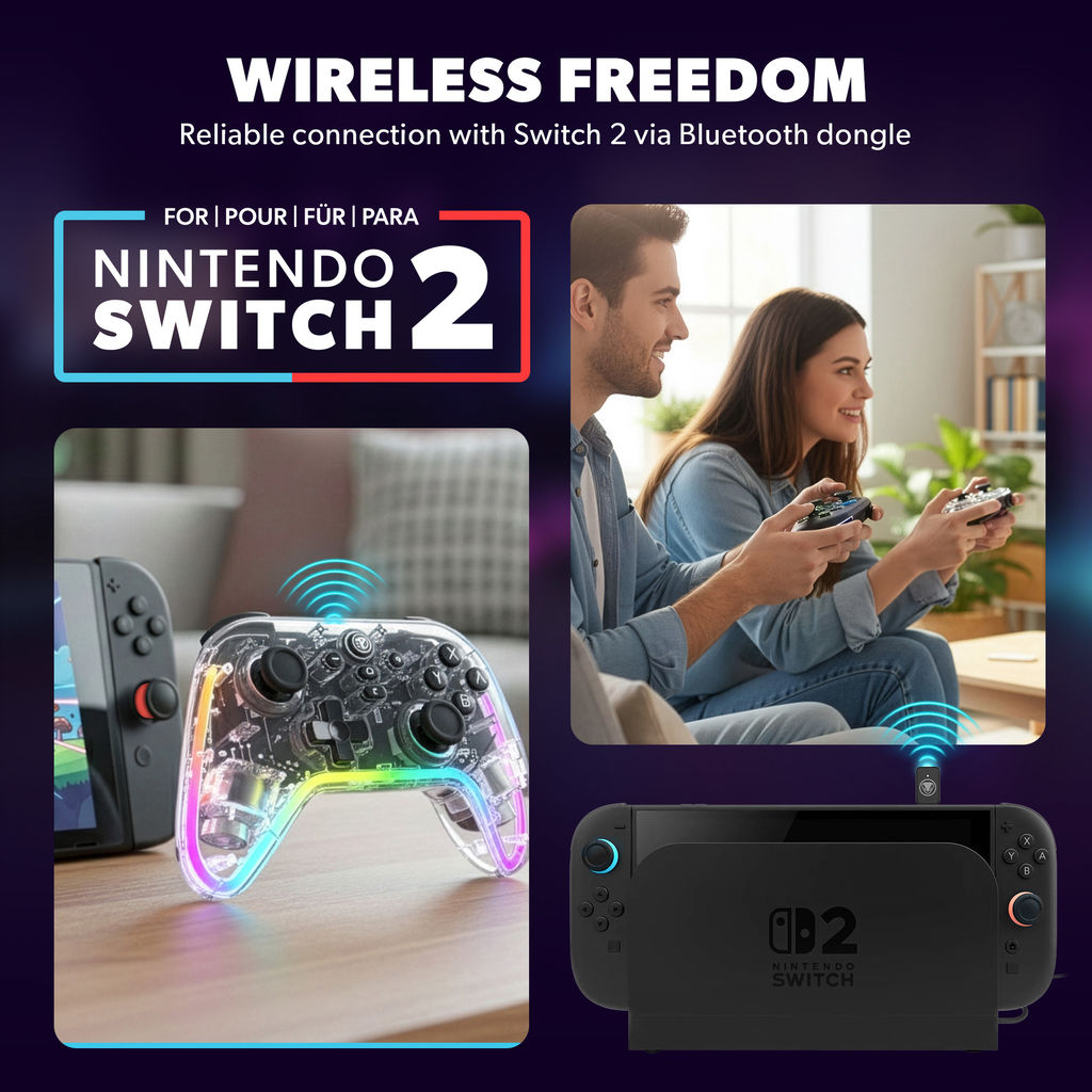 Erleben Sie Präzision mit dem GamePad RGB S2 WIRELESS PRO CONTROLLER FÜR NINTENDO SWITCHTM 2, der Hall-Effekt-Sticks für präzise analoge Steuerung, ein ergonomisches Design für Komfort und eine zuverlässige wireless Verbindung bietet.
