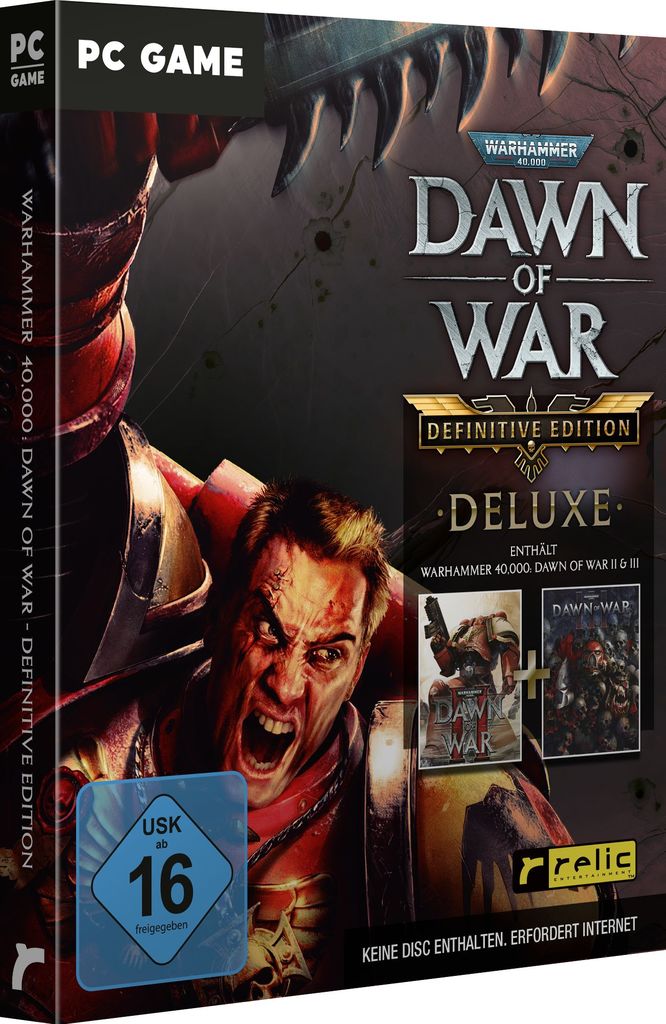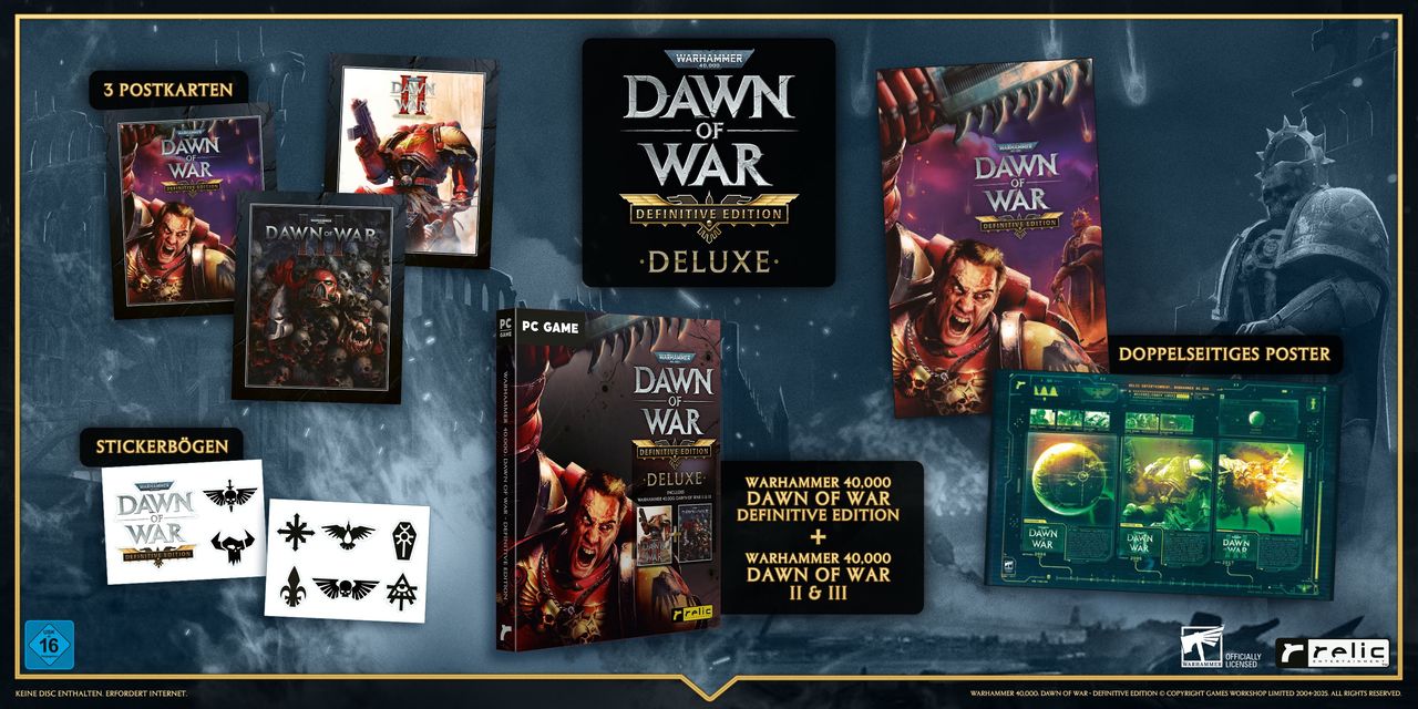 Diese Deluxe-Kollektion enthält die gesamte Saga - inklusive Steam-Codes für Dawn of War - Definitive Edition, Dawn of War II - Anniversary Edition und Dawn of War III - sowie folgende exklusive physische Sammlerstücke: